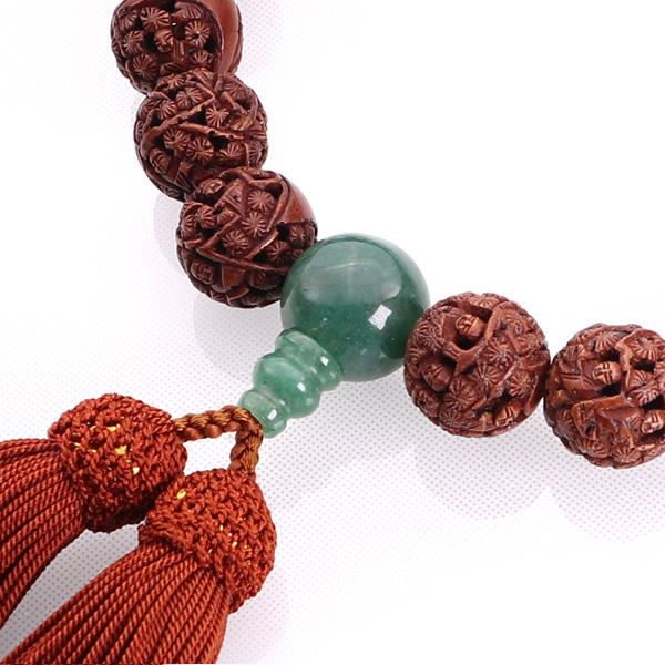 熟練の職人がひとつひとつ丁寧に彫り上げた「羅漢彫 インド翡翠仕立 18玉」は、インド翡翠(ヒスイ)との色のコントラストも美しい男性用の念珠です。